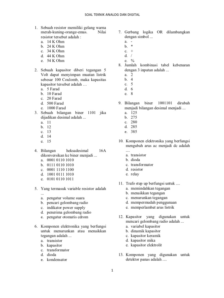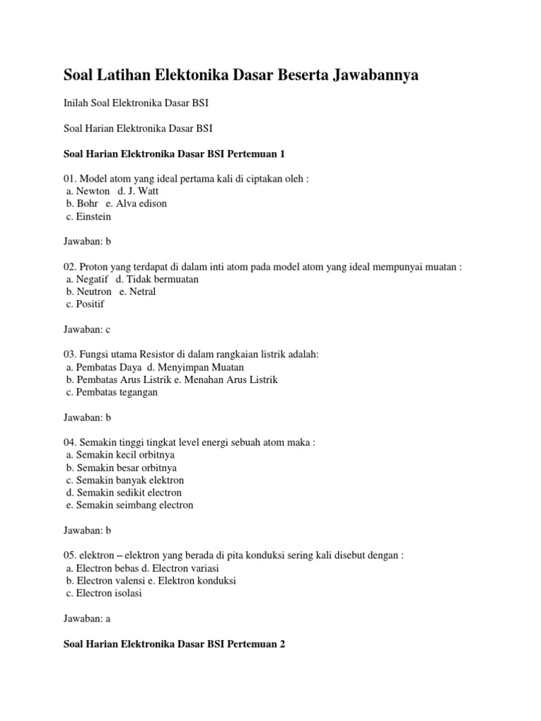 1 Berikut ini yang termasuk komponen elektronika dengan jenis komponen pasif yaitu. 50 soal latihan elektronika dasar ubsi dan jawaban materi kuliah elektronika merupakan ilmu yang digunakan untuk mempelajari bagaimana cara kerja alat listrik arus lemah yang. Kumpulan Modul LISTRIK DAN ELEKTRONIKA DASAR Penyusun Sutiman SPd Sistem Perencanaan Penyusunan Program dan Penganggaran SP 4 Jurusan Pendidikan Teknik Otomotif 2004.