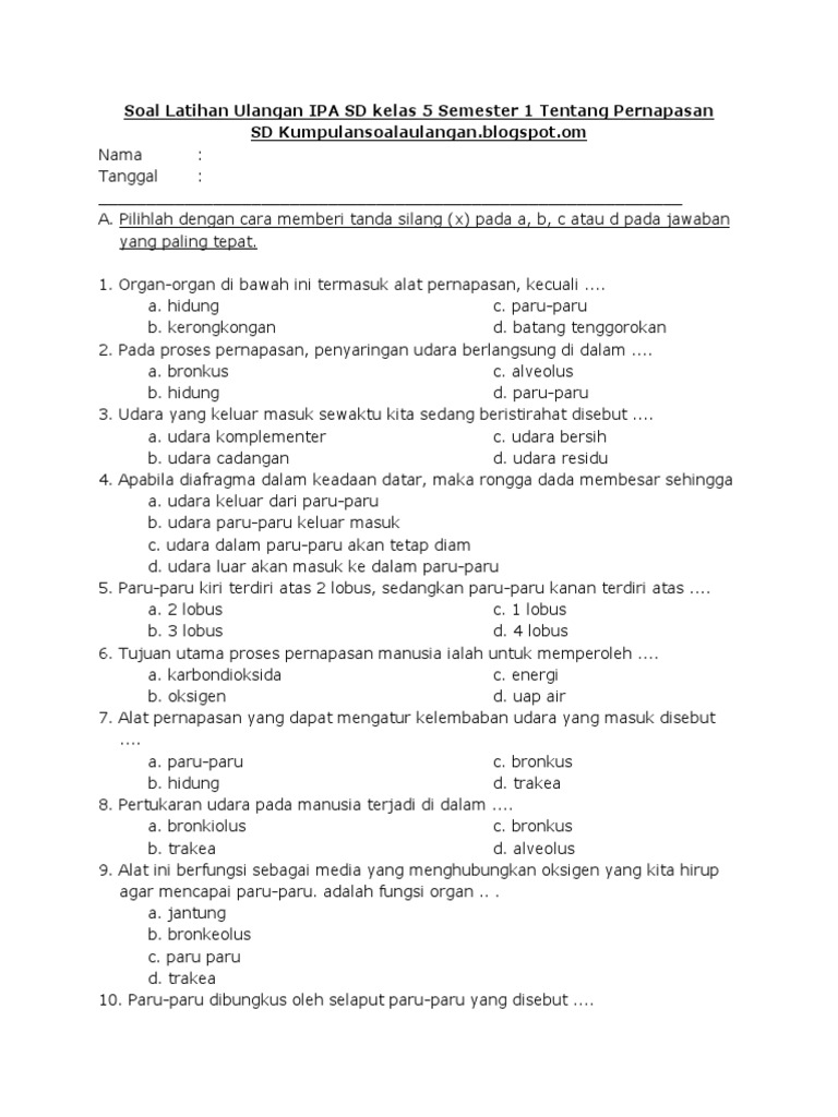Soal Latihan Ulangan Ipa Sd Kelas 5 Tentang Pernapasan