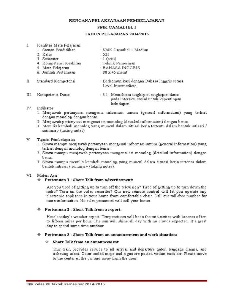 Rpp Bahasa Inggris Smk Kelas Xii Maskapai Penerbangan Bahasa