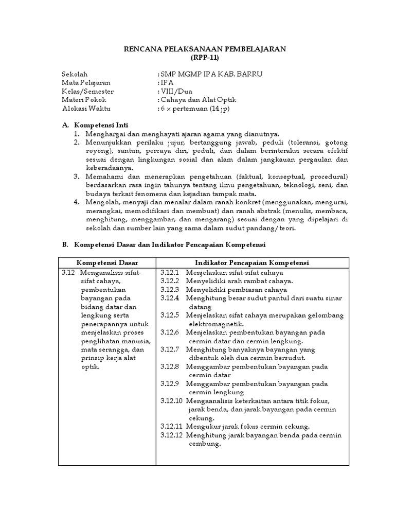 Kls 8 Rpp Bab 11 Cahaya Dan Alat Optik