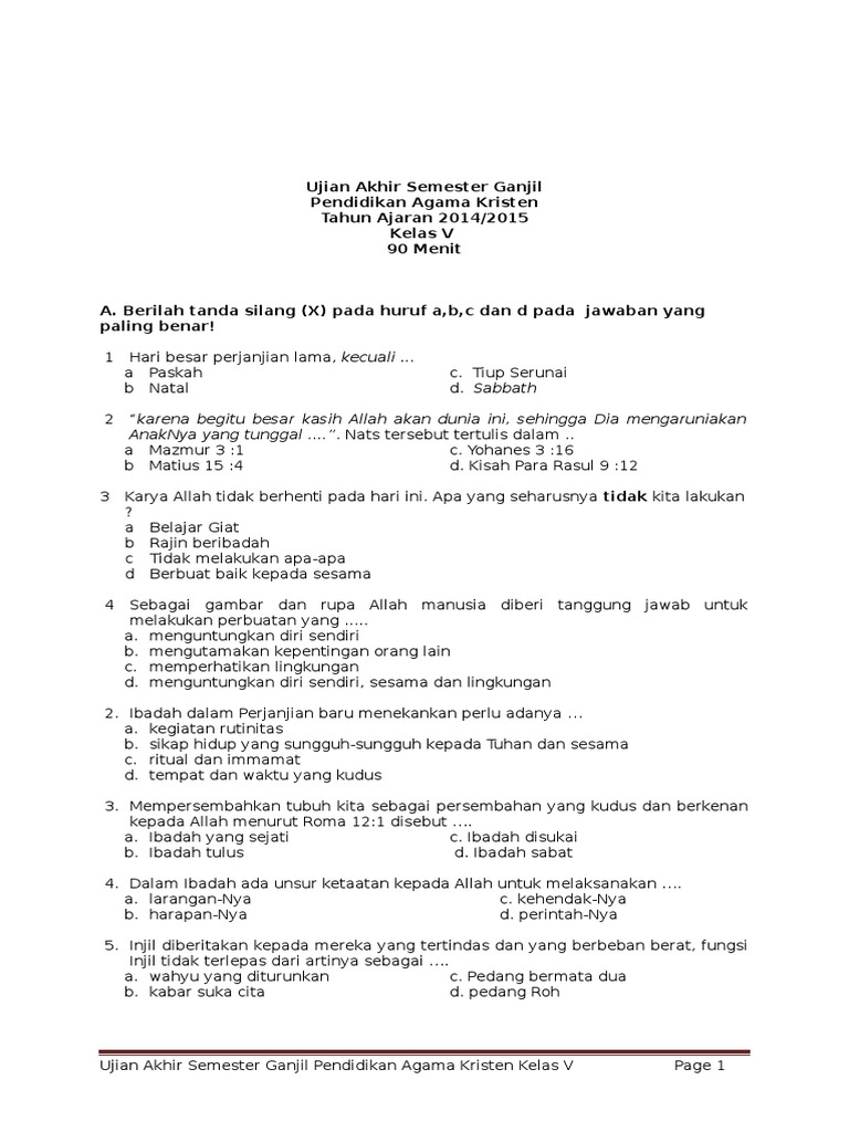 Soal-ujian-agama-kristen-smp-kelas-8-semester-1 Berikut ini adalah file tentang soal-ujian-agama-kristen-smp-kelas-8-semester-1 yang bisa kalian unduh secara gratis dengan menekan tombol download pada tautan link di bawah ini. Agama Kristen Kelas IX Posted by azhar azhari at June 06 2020 2 comments Soal 1. Berikut kumpulan soal soal penilaian akhir semester pelajaran pai pendidikan agama islam smp kelas 8 semester.