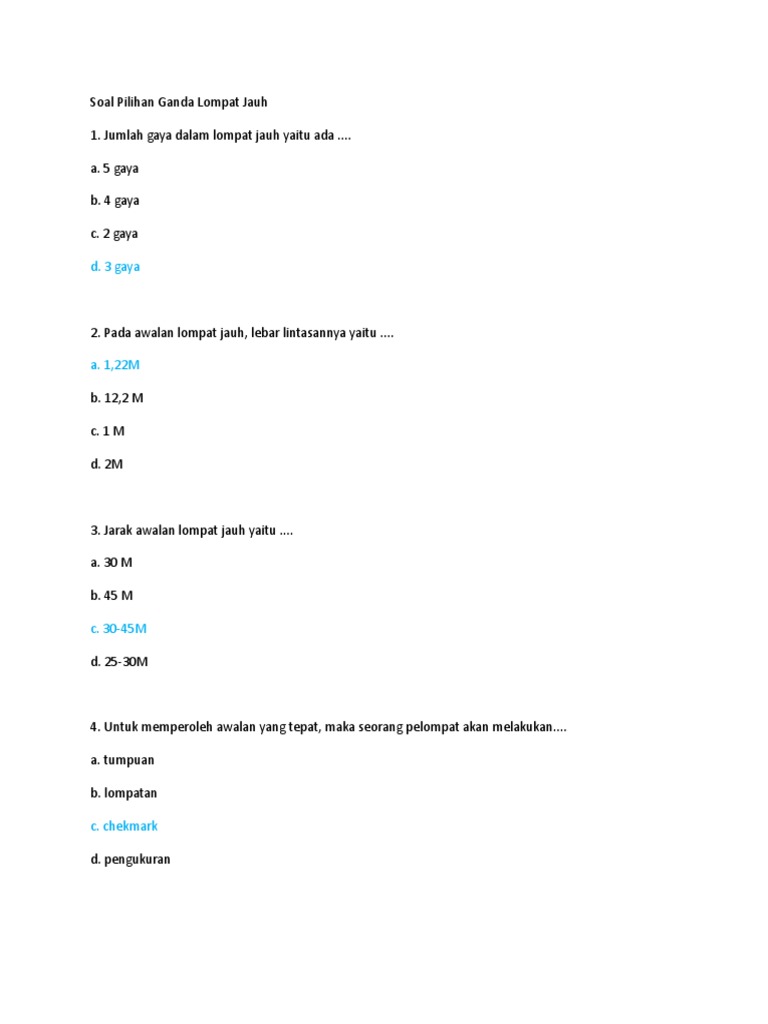 Download Kumpulan Soal Dan Jawaban Lompat Jauh PDF 1400 MB - SamPDF SamPDF Soal SKB PJOK cpns 2020 materi Lompat Jauh SoalJawaban SKB guru PJOK dengan materi lompat jauh 25 soal Ayo bagi yang bosan. Berikut ini kami akan sajikan 20 soal pilihan ganda tentang lompat jauh beserta jawabannya yang sudah kami susun dari berbagai sumber langsung saja kita lihat di. Kumpulan Soal Dan Jawaban Lompat Jauh Soal pilihan ganda tentang lompat tinggi dan jawaban.