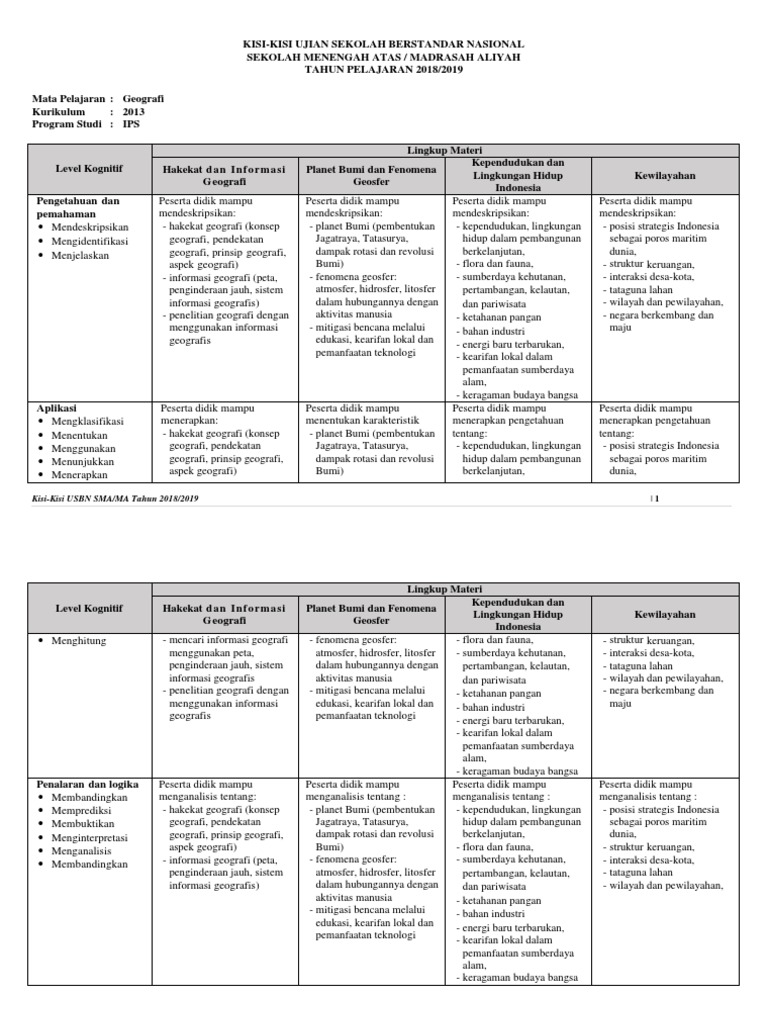 Kisi-Kisi USBN Paket CULYA Tahun 20182019 2 Level Kognitif Lingkup Materi Hakekat dan Informasi Geografi Pembentukan Jagadraya Tatasurya Bumi dan Fenomena Geosfer Kependudukan dan Lingkungan Hidup Kewilayahan Penalaran Membandingkan Memprediksi Membuktikan Mengkombinasi Menganalisis Peserta didik dapat menganalisis. Download Soal USBN Sosiologi 2019 PDF DOC Alhamdulillah pelaksanaan USBN 2019 mapel Sosiologi sudah selesai. Kalo merujuk dari tabel tersebut hampir semua bahasan yang ada di geografi disebut di kisi-kisi dan kemungkinan besar muncul pas UN 2019 nanti.